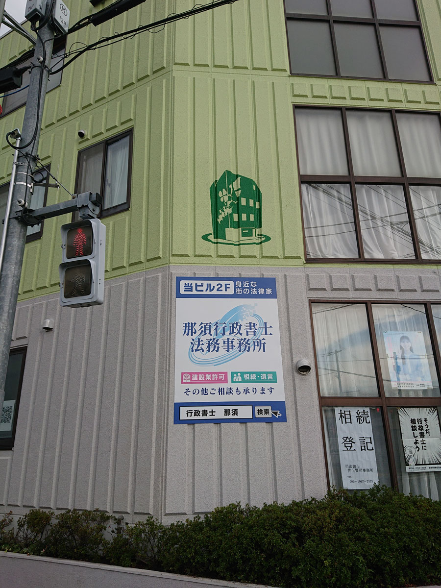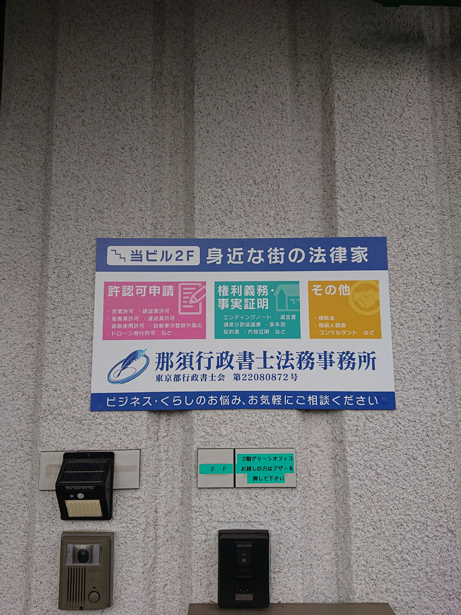 マンション内の建植サイン、駐輪場屋根のテント掛け、オフィス外壁サイン、飲食店看板、キッチンカーシートラッピング等全てデザインから制作、施工まで一貫して行っています。